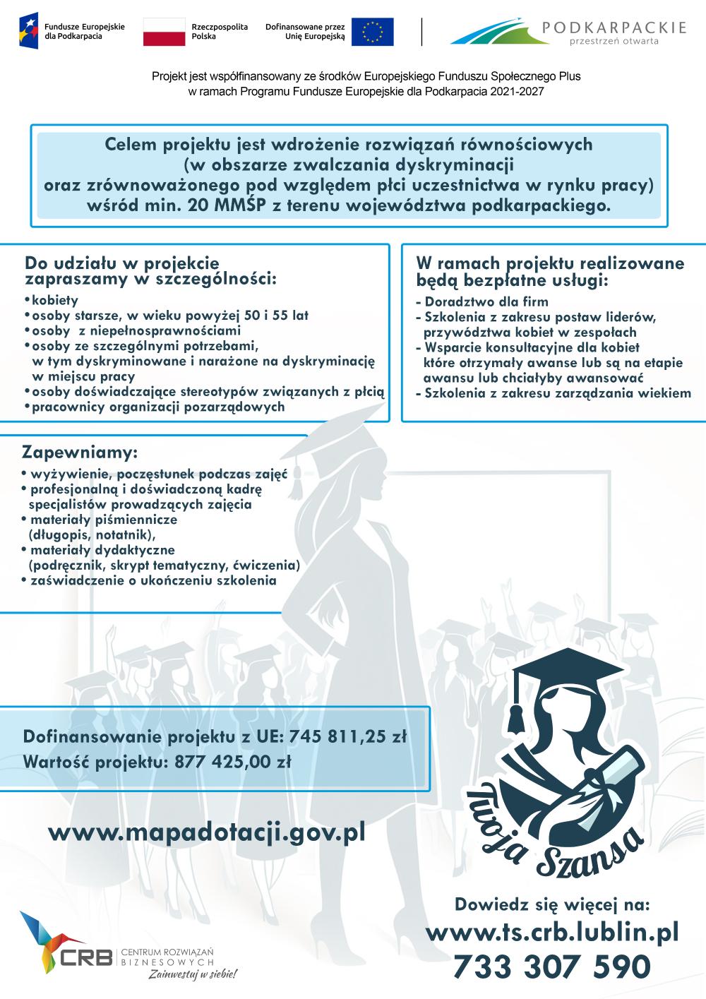 Fundacja Centrum Rozwiązań Biznesowych rozpoczyna realizację projektu: „Twoja szansa – czas na rynek pracy bez dyskryminacji i bez segregacji płci”, który jest współfinansowany ze środków Europejskiego Funduszu Społecznego Plus w ramach Programu Fundusze Europejskie dla Podkarpacia 2021-2027